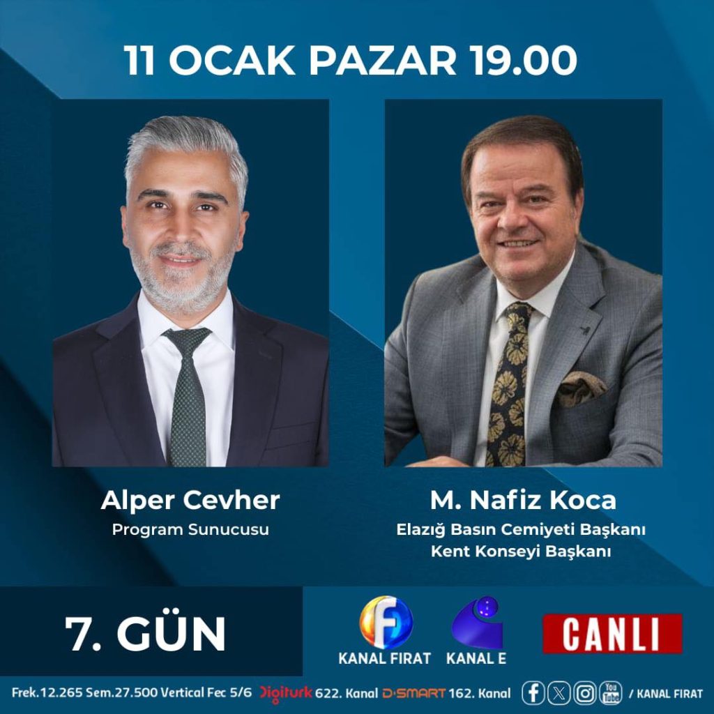 Başkanımız Sn. M.Nafiz KOCA; bu akşam Kanal Fırat ve Kanal E ortak yayını ile saat 19.00’da 7.Gün Programının Canlı Yayın Konuğu olacaklar.