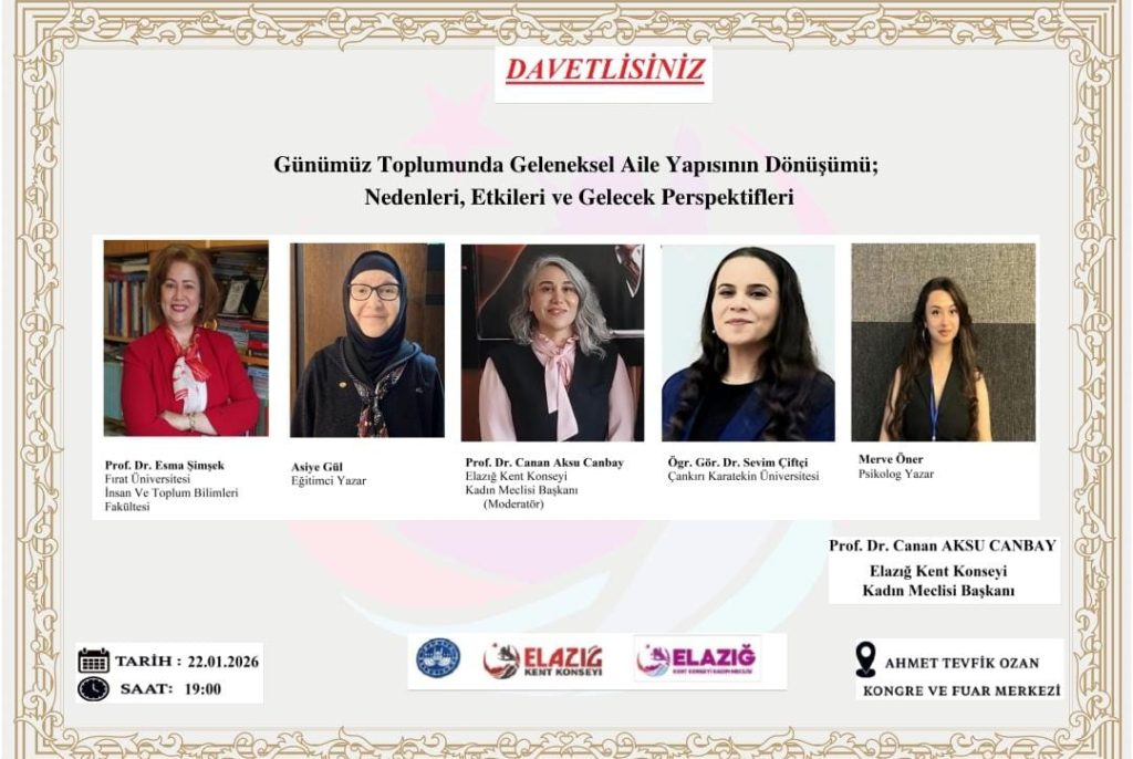22 Ocak Perşembe günü akşam saat 19.00’da Ahmet Tevfik Ozan Kongre ve Fuar merkezinde “Günümüz Toplumunda Geleneksel Aile Yapısının Dönüşümü Nedenleri Etkileri ve Gelecek Perspektifleri “panelimize tüm Elazığlı hemşehrilerimizin katılımını bekliyoruz.